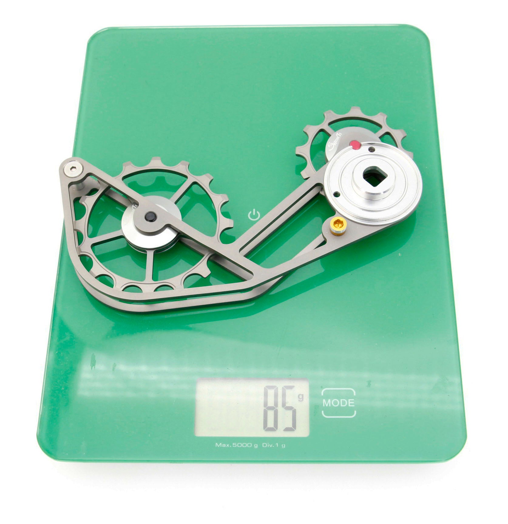 The system consists of Top 12t & Bottom 16t alloy pulley wheels fitted with low friction bearings and a lightweight strong cage made from Titanium material.