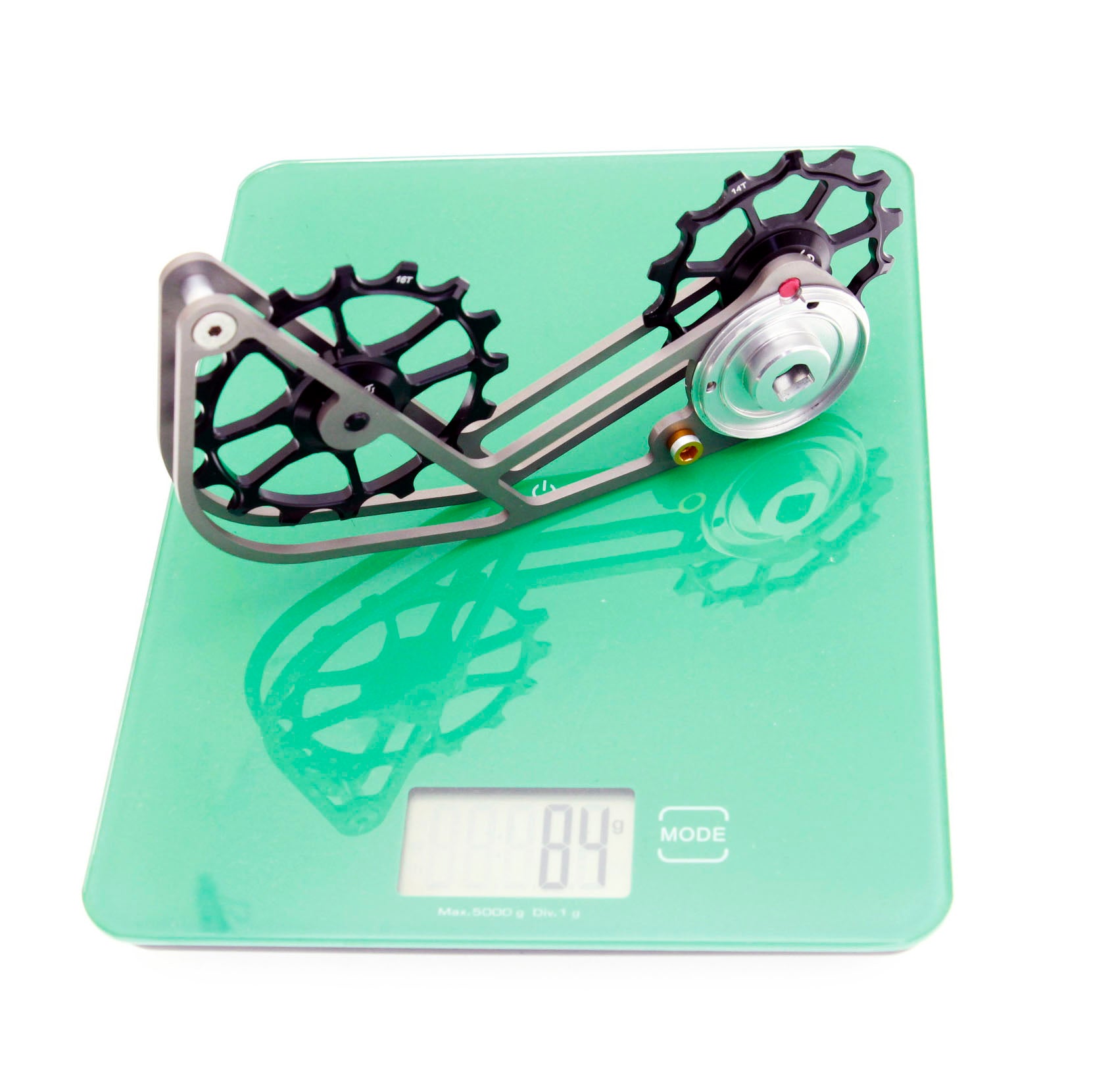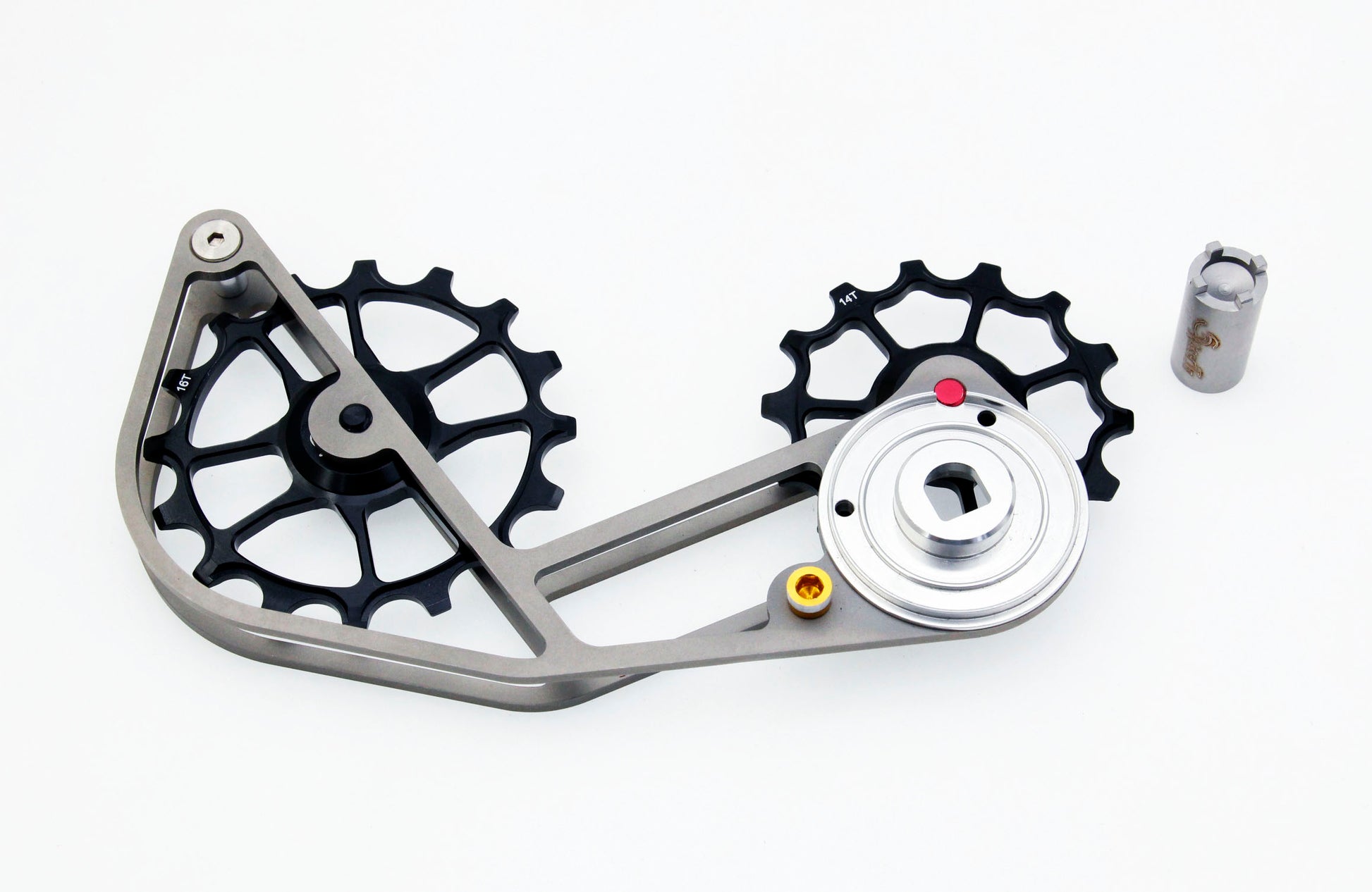 The system consists of Top 14t & Bottom 16t alloy pulley wheels fitted with low friction bearings and a lightweight strong cage made from Titanium material.