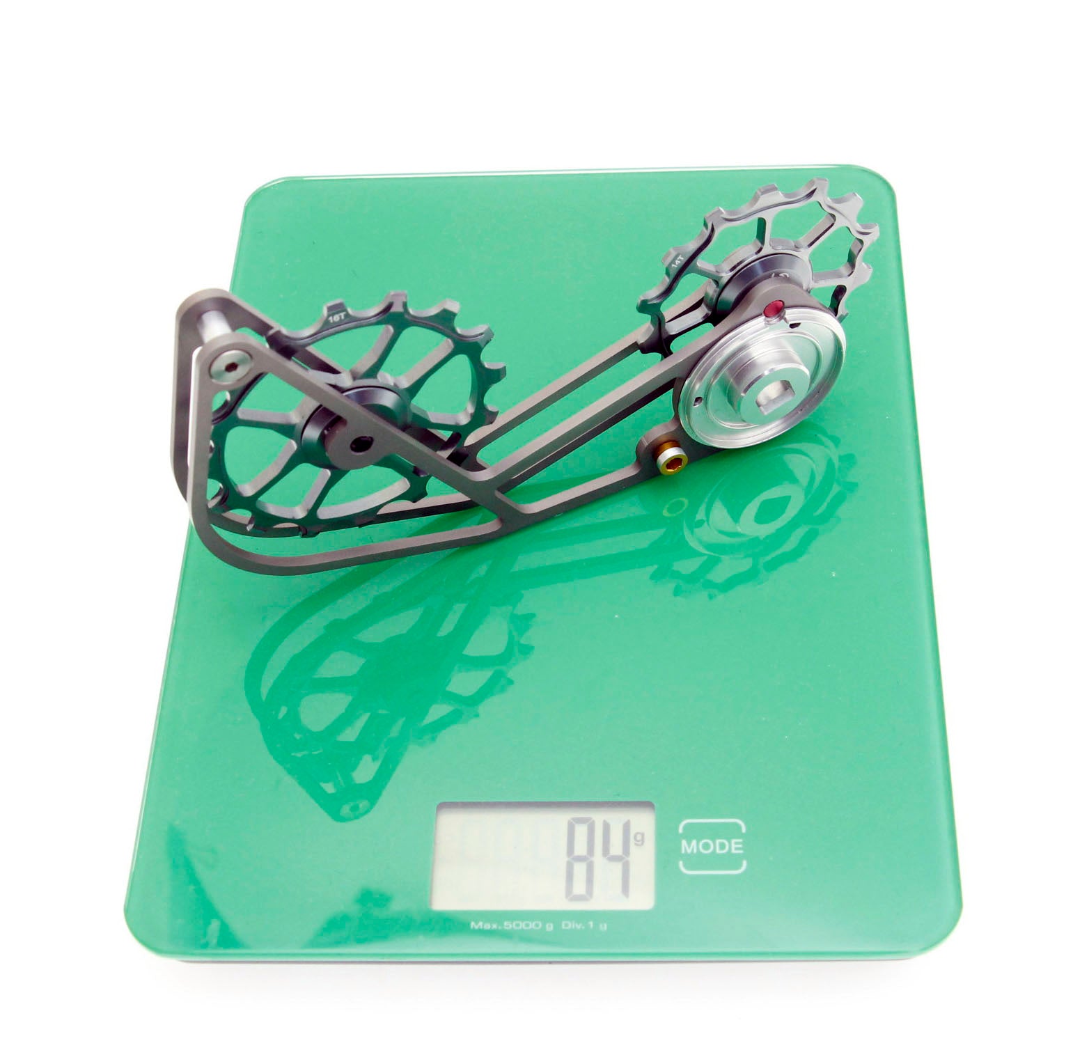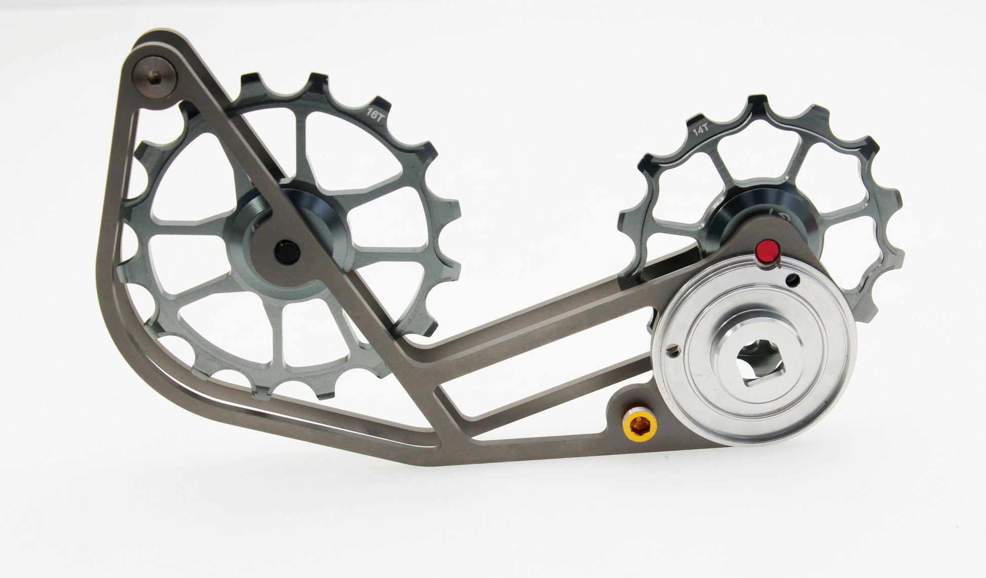 The system consists of Top 14t & Bottom 16t alloy pulley wheels fitted with low friction bearings and a lightweight strong cage made from Titanium material.